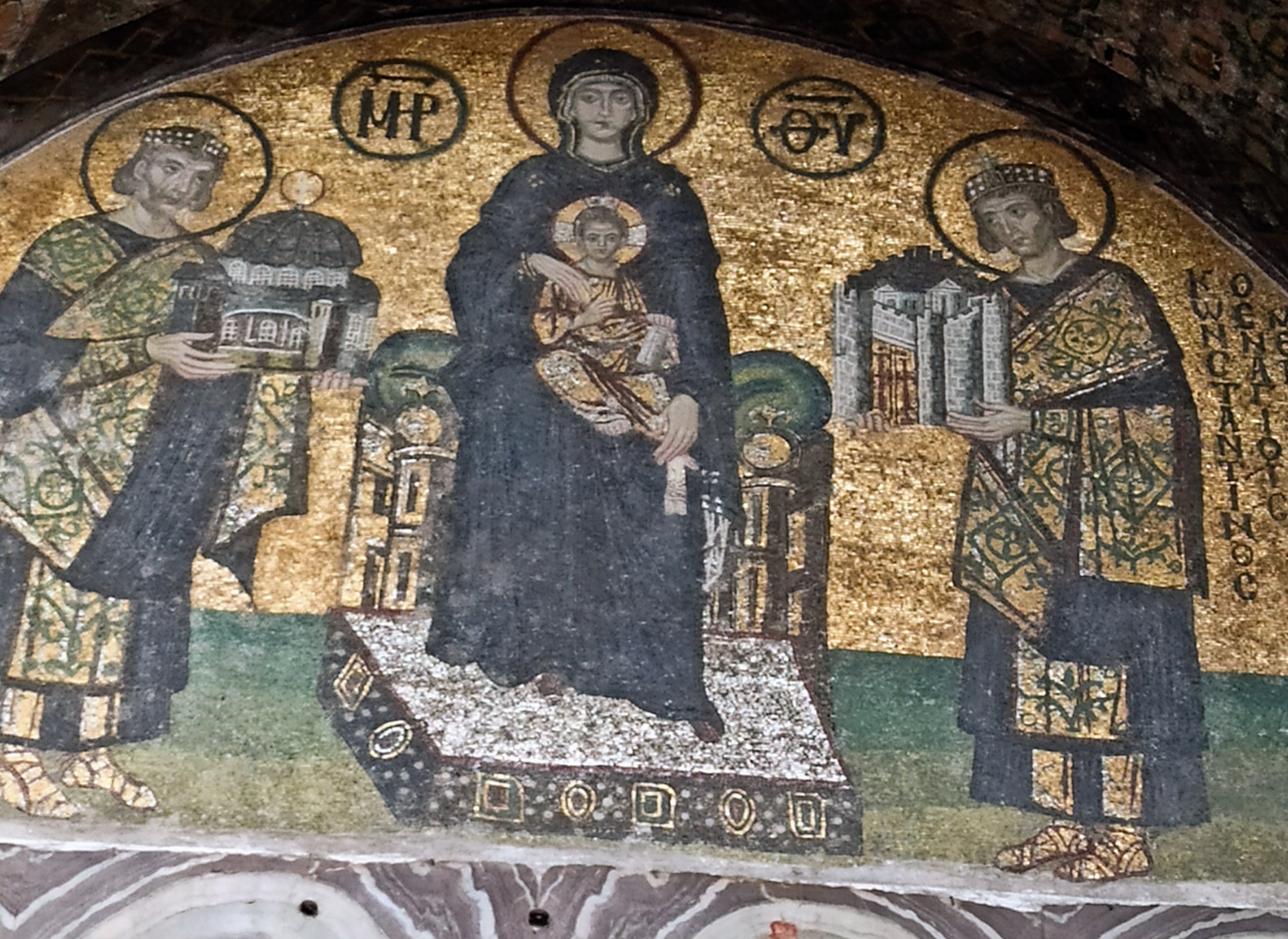 En este mural en Santa Sofia (Estambul) vemos la imagen de Maria con su hijo y al lado dos reyes que le ofrecen a la reina del mundo, una basilica y una mezquita. Uno es Constantino, creo