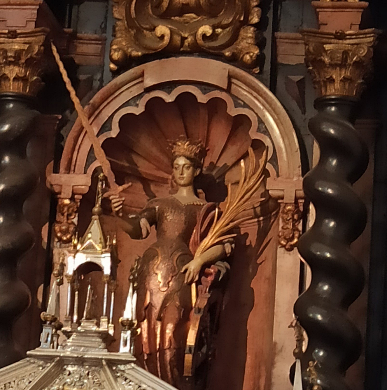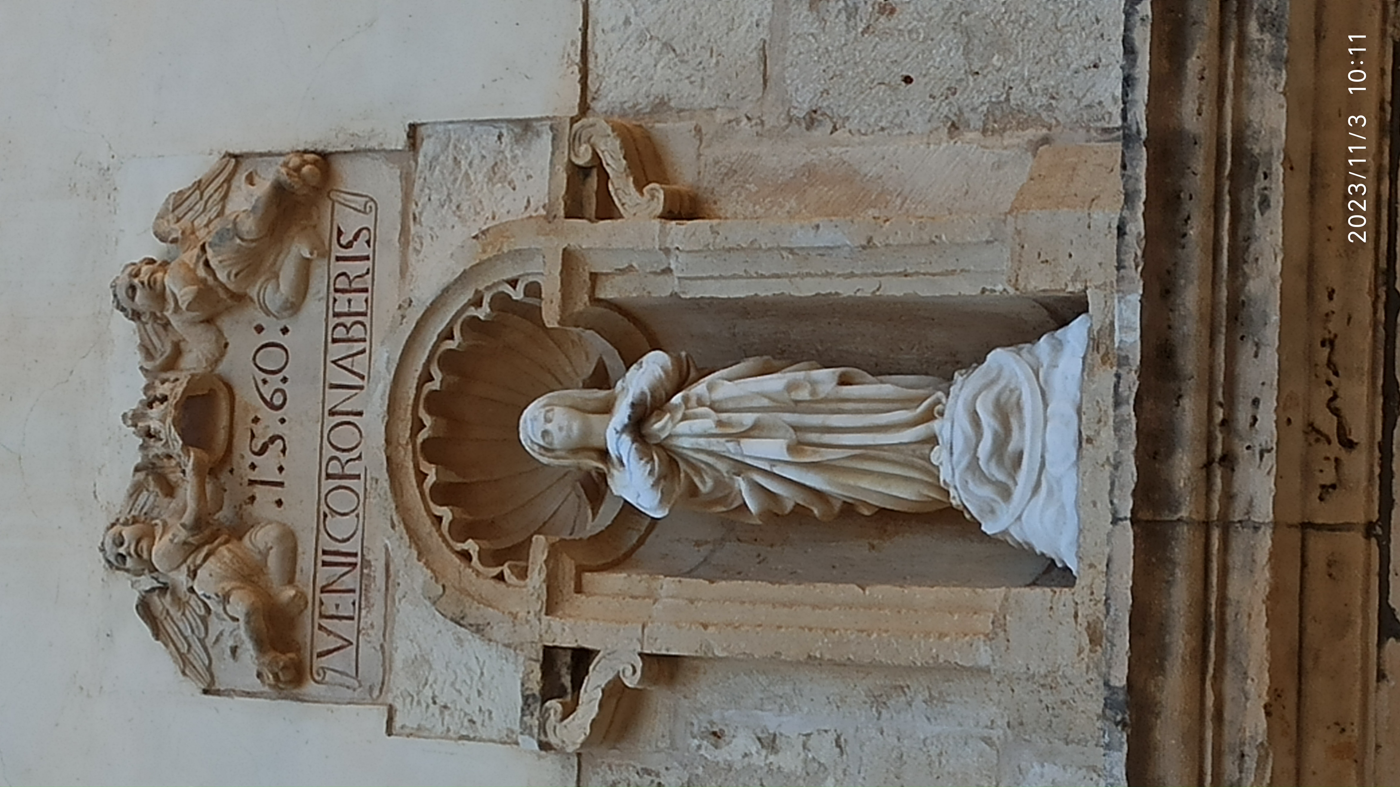 Llama mucho la atención cuando lo ves porque tanto detrás como en la parte delantera, en los arcos más grandes, hay unas hornacinas enclavadas, en una se ve la estatua de Maria y Iezus en brazos y en el otro lado la hornacina está vacia y la guia nos dijo que antes habia una estatua de San Sebastián.
