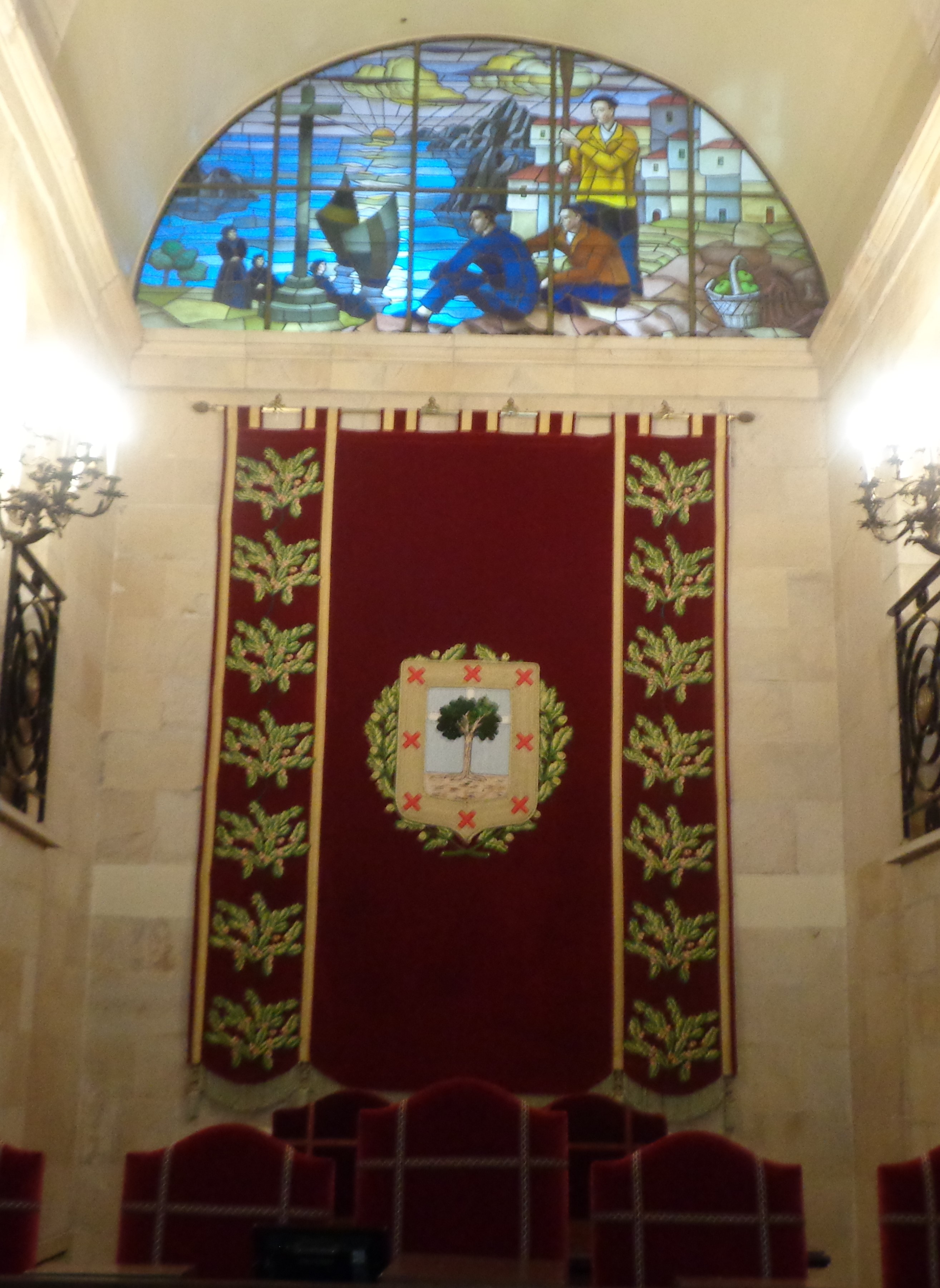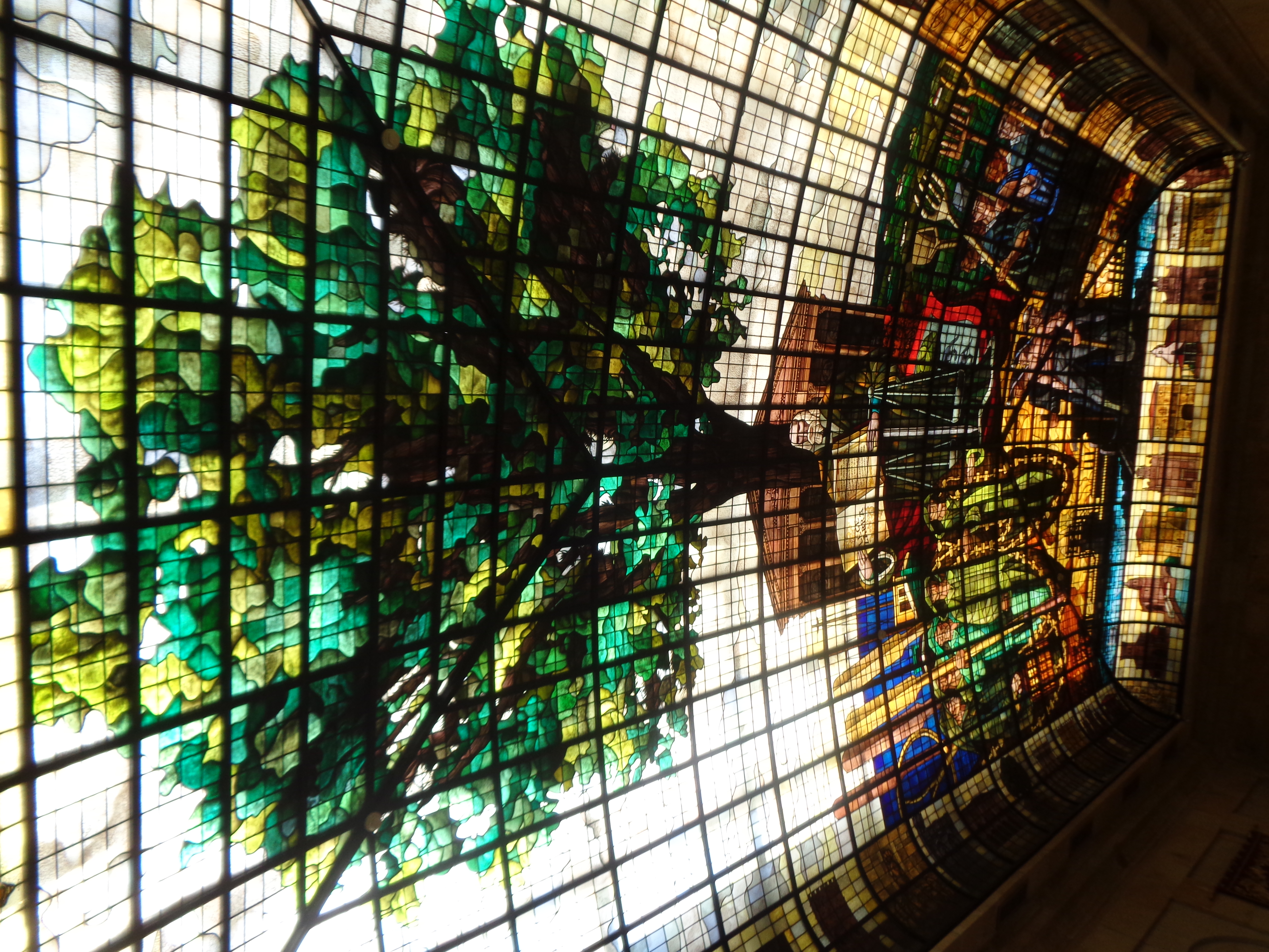 Uno de los techos de una gran sala, es una formidable vidriera con las imágenes de una reunión debajo de un gran árbol, un roble.